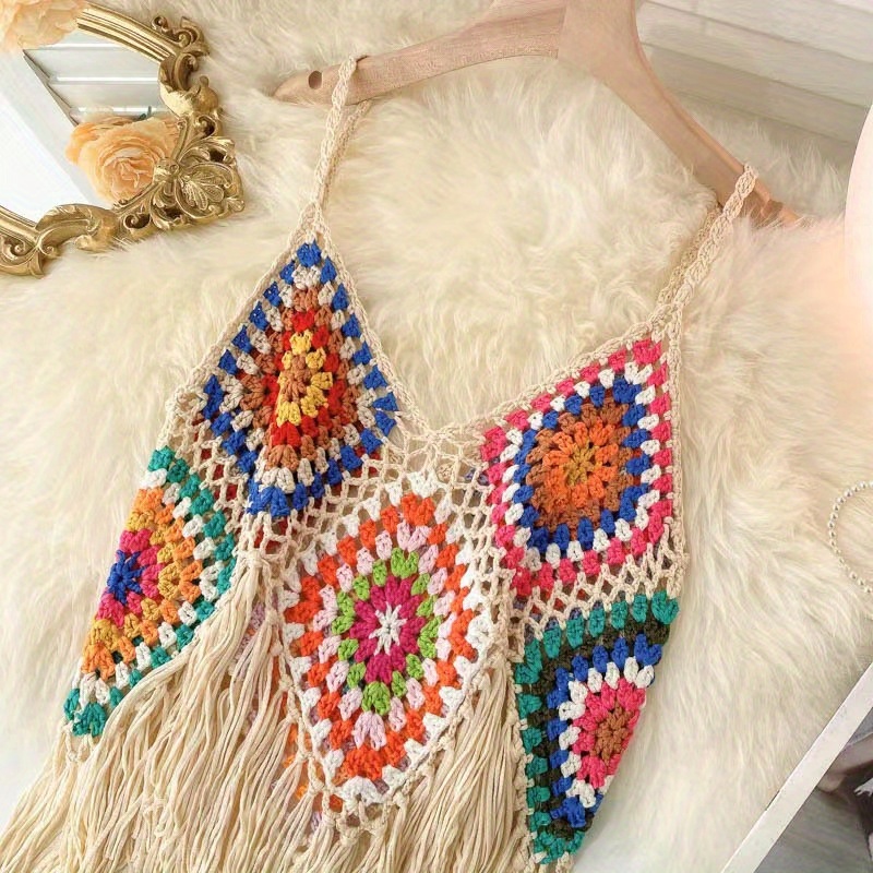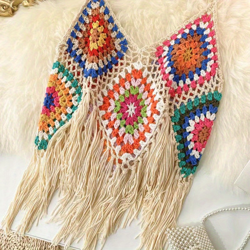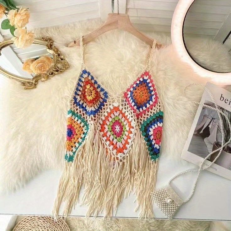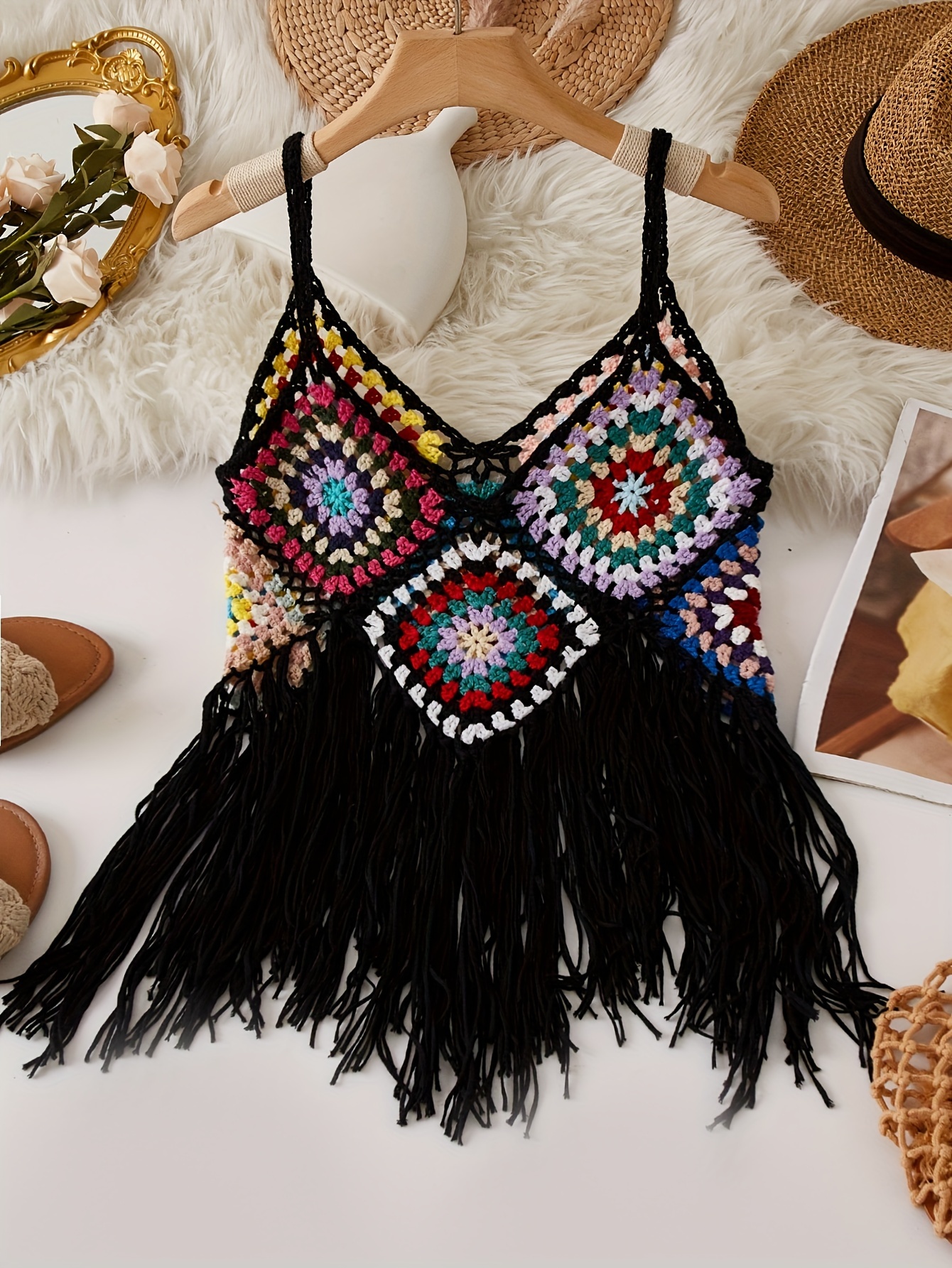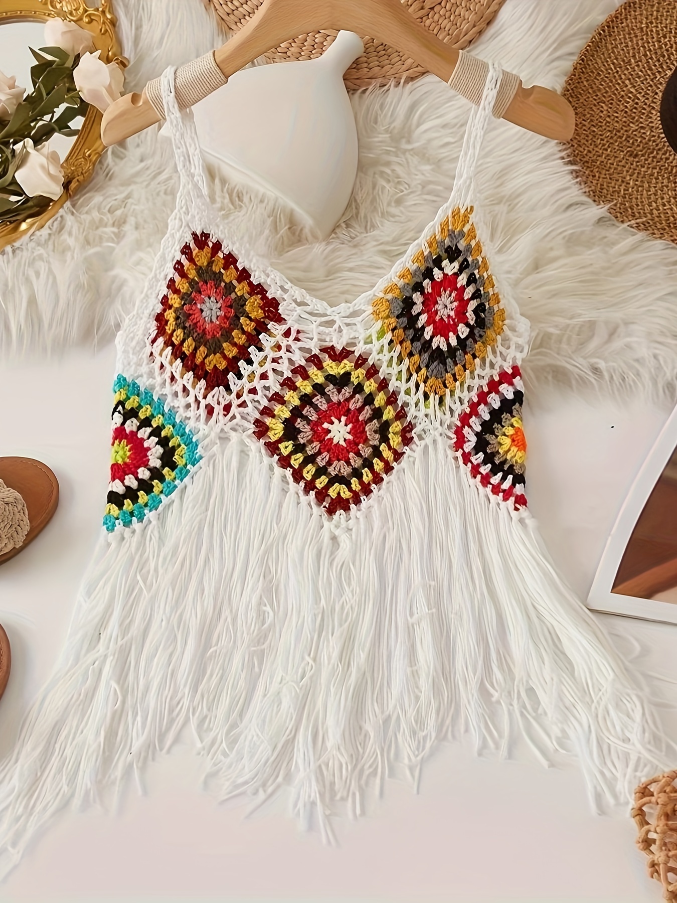Colorful Boho Crochet Fringe Cami Top - V-Neck, Sleeveless, Versatile & Vacation-Ready, Handmade Acrylic Tassel Detail, Perfect for Layering