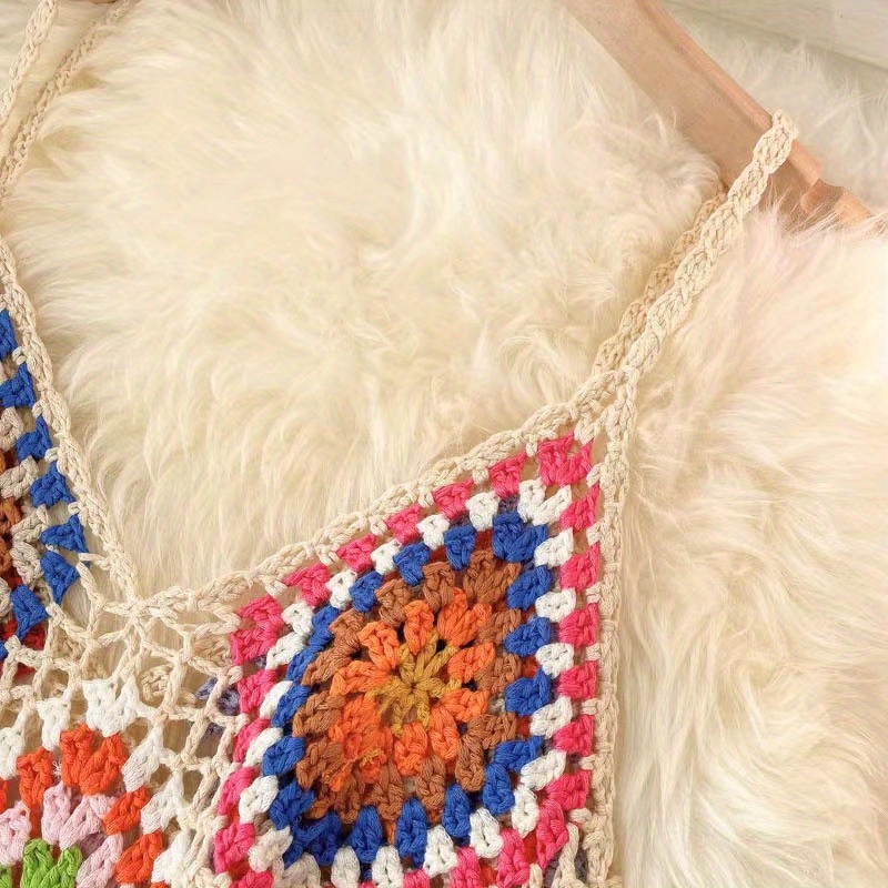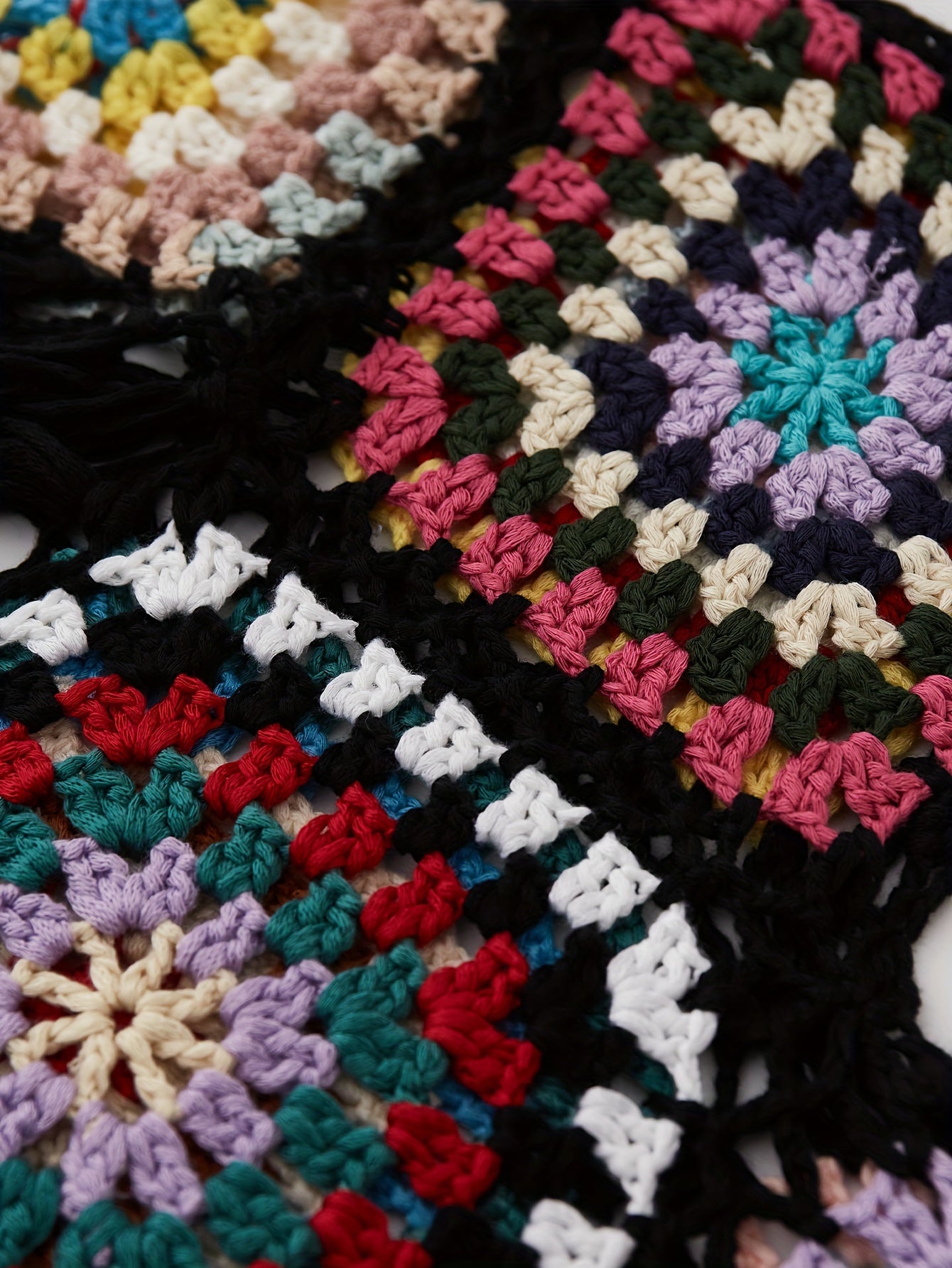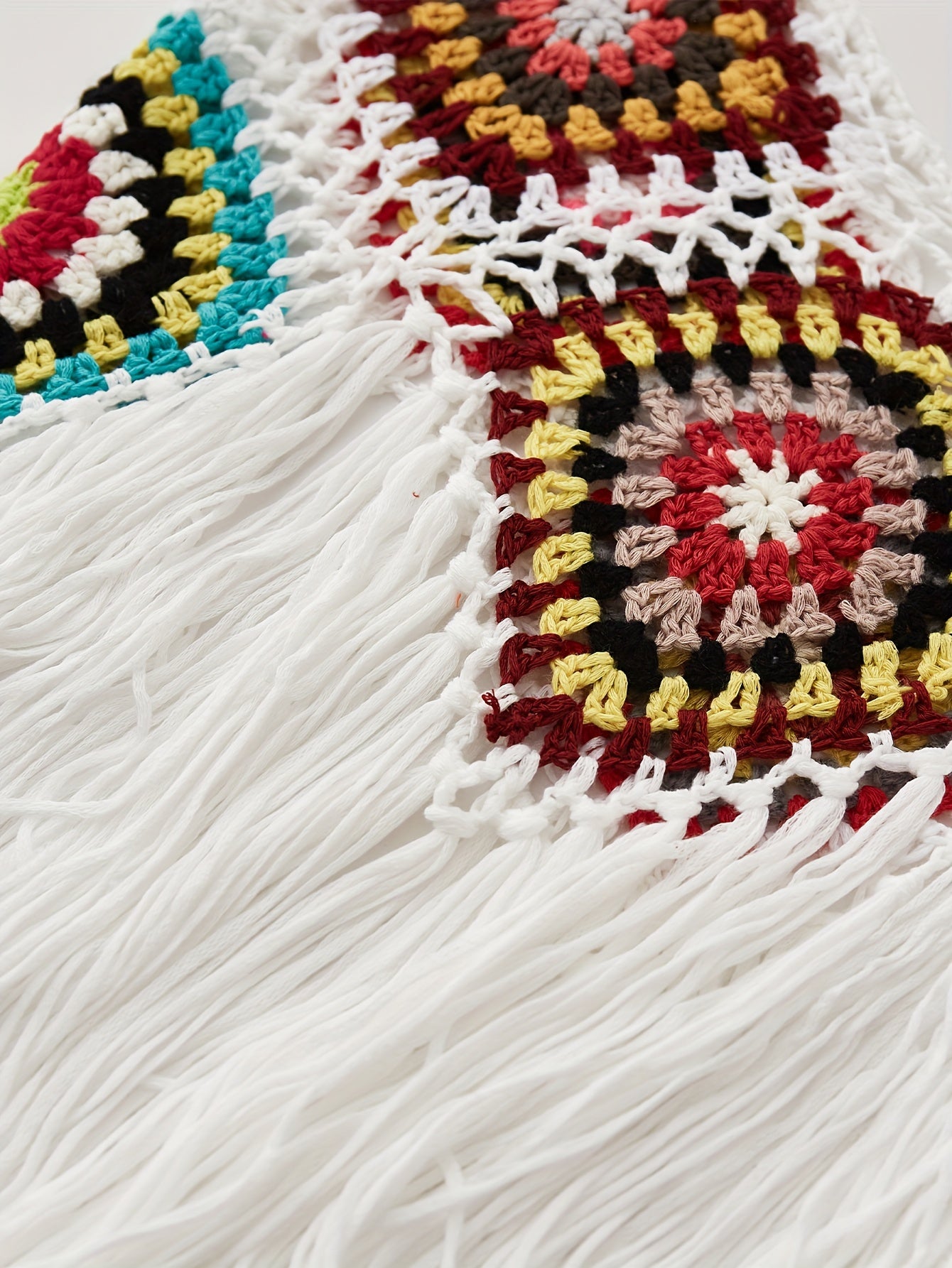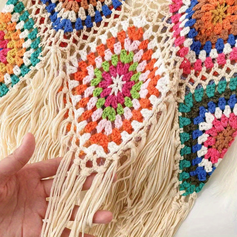 Colorful Boho Crochet Fringe Cami Top - V-Neck, Sleeveless, Versatile & Vacation-Ready, Handmade Acrylic Tassel Detail, Perfect for Layering