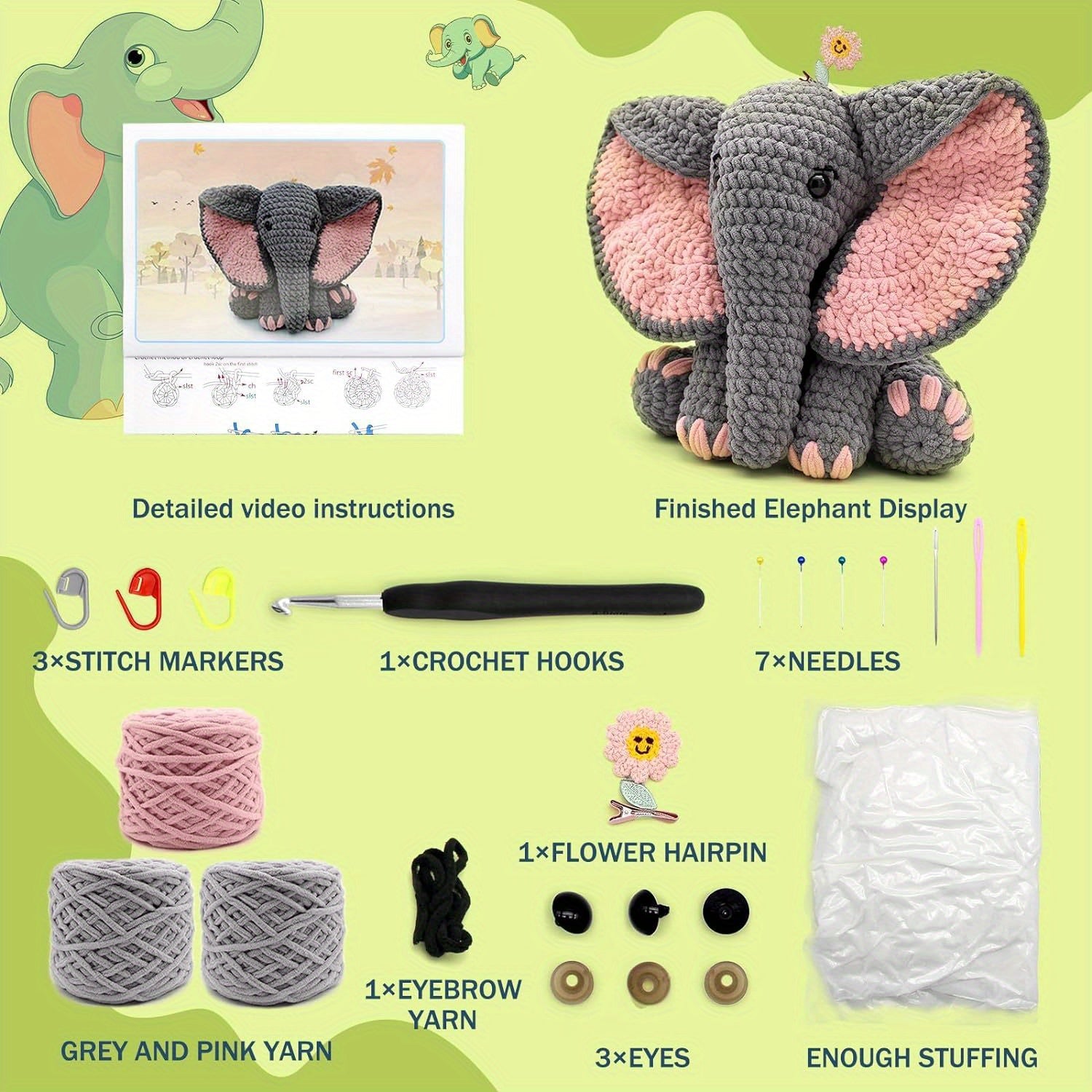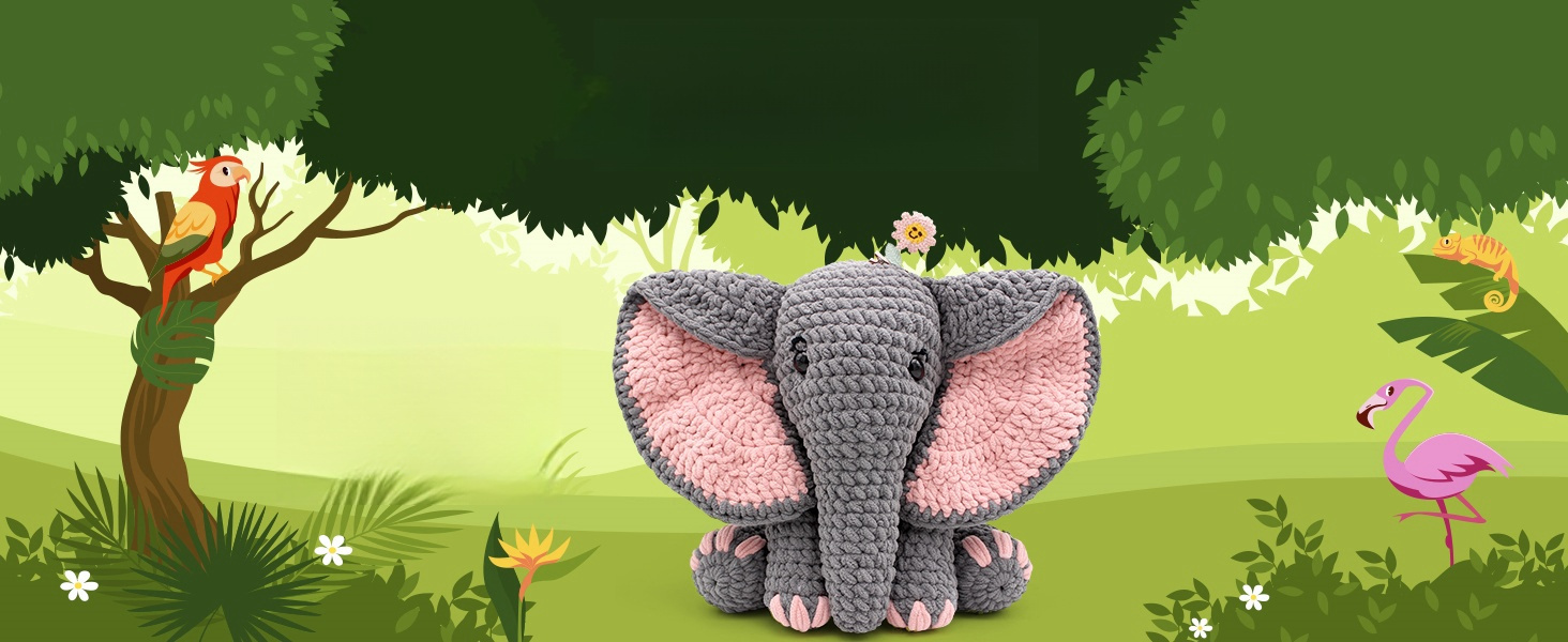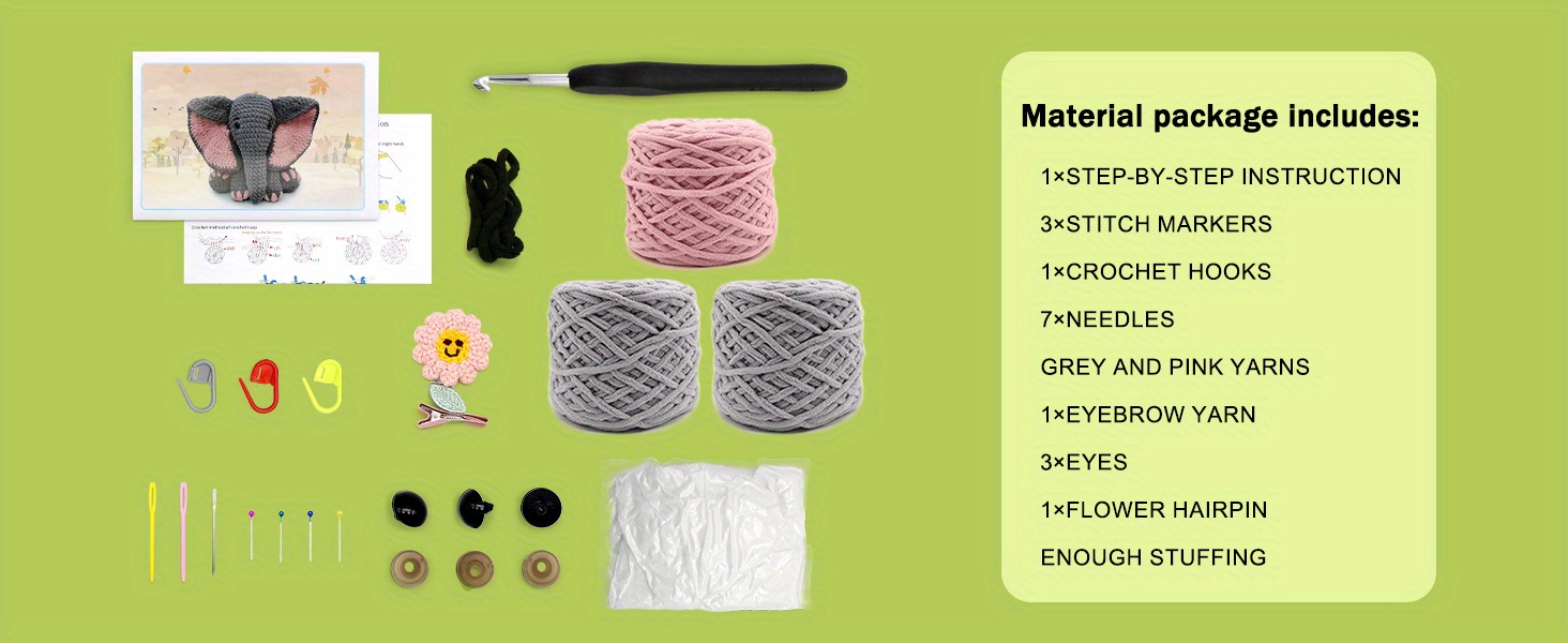 BEGINNER'S CROCHET SET: This starter kit has all the essentials to begin your crochet journey: 3 stitch markers, 1 crochet hook, 7 needles, 3 eyes, 1 flower hairpin, ample yarn and stuffing, plus a basic crochet pattern guide that features a QR code for video tutorials. If you're an experienced crocheter, feel free to modify the elephant's design with your own DIY ideas (there's plenty of material, so you won't run out).