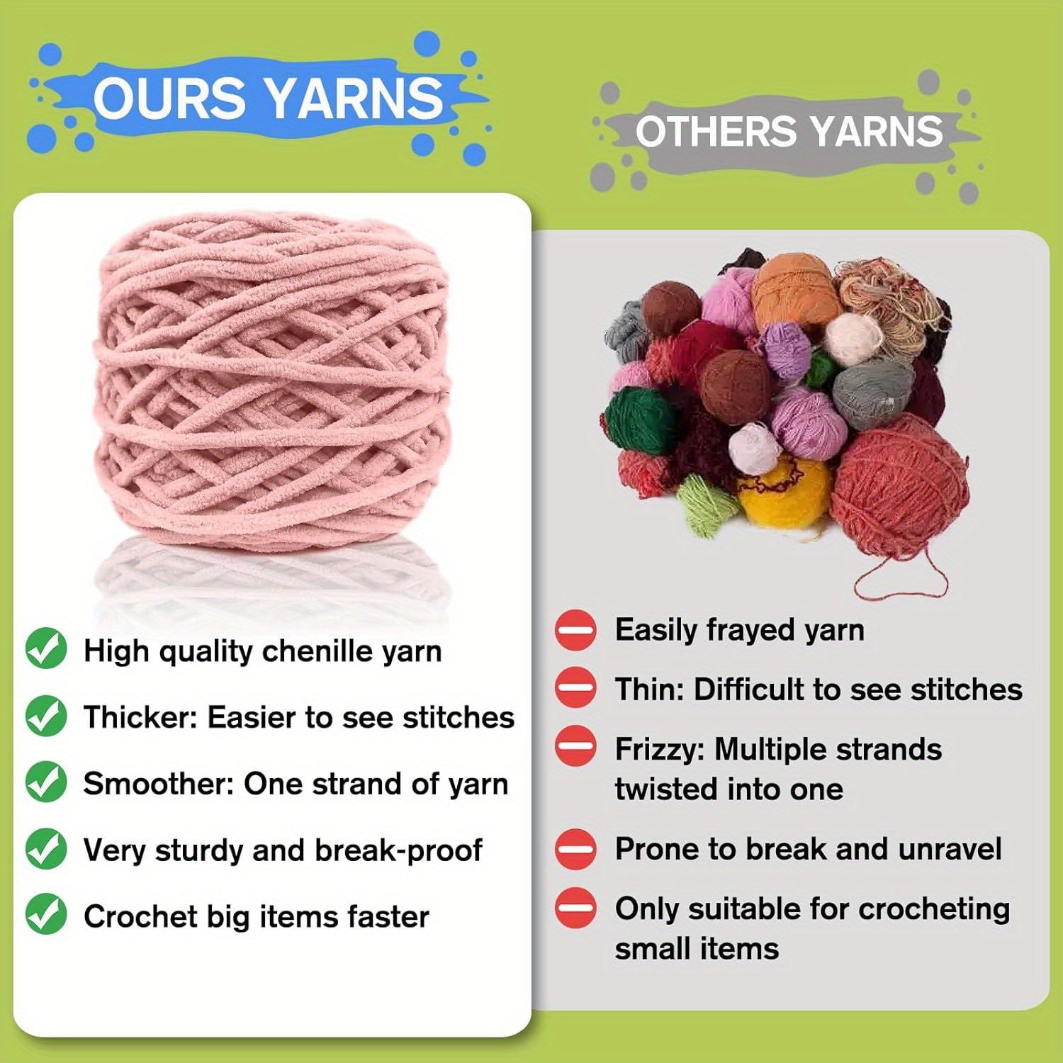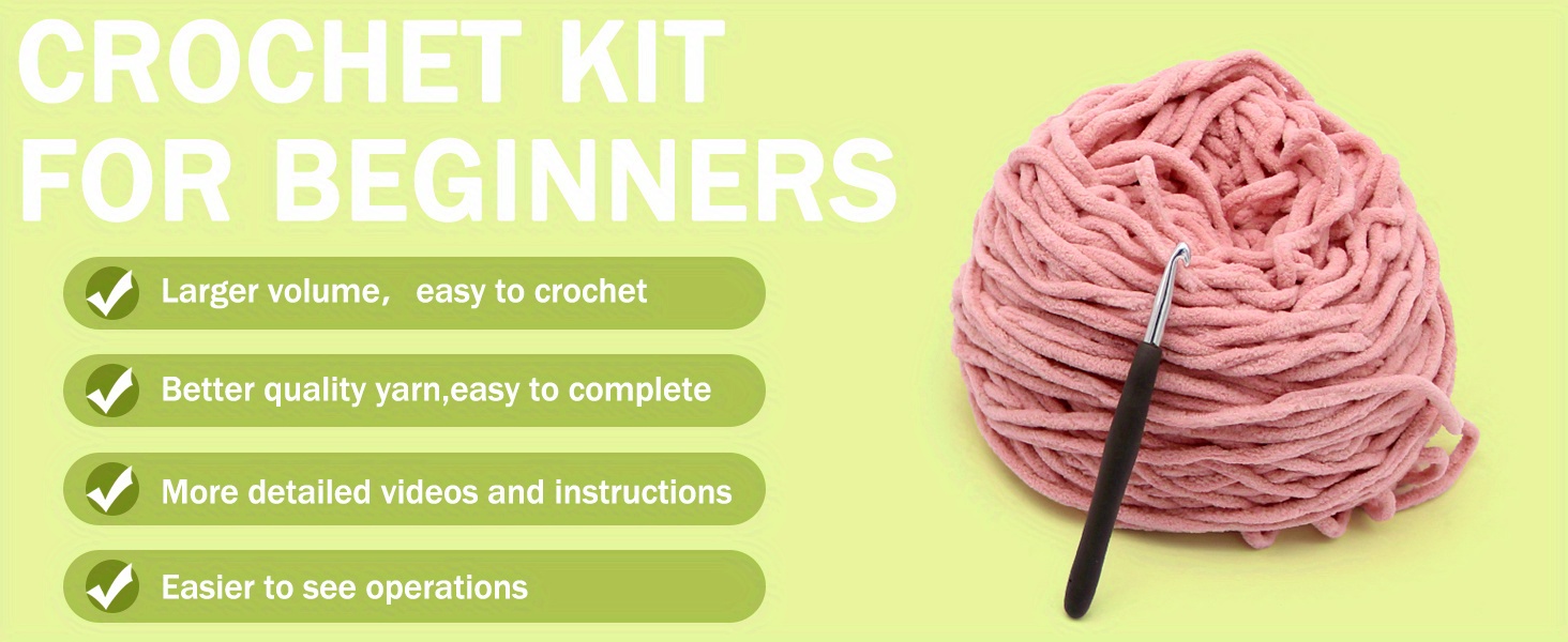 PREMIUM YARN: In contrast to the thin yarn produced by other brands that combines several strands, we utilize high-quality Chenille yarn, which is a thicker and softer single-ply option. This type of yarn allows for smoother crocheting and more defined stitches. Chenille yarn is ideal for novices learning to crochet, as it is durable and won't easily break or unravel, even if you need to undo and redo your work due to inexperience.