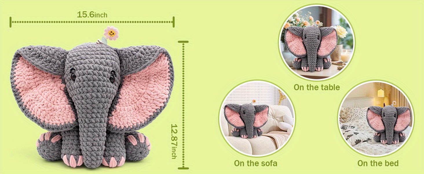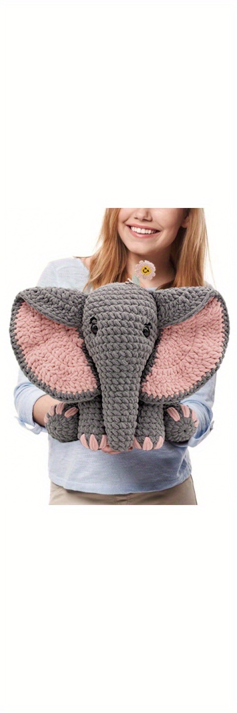 This 13-inch crochet animal kit features an elephant that is significantly larger than typical crochet stuffed animals available, comparable to a medium-sized plush doll. Once you finish crocheting, this handcrafted elephant will serve as an ideal companion for playtime and bedtime.