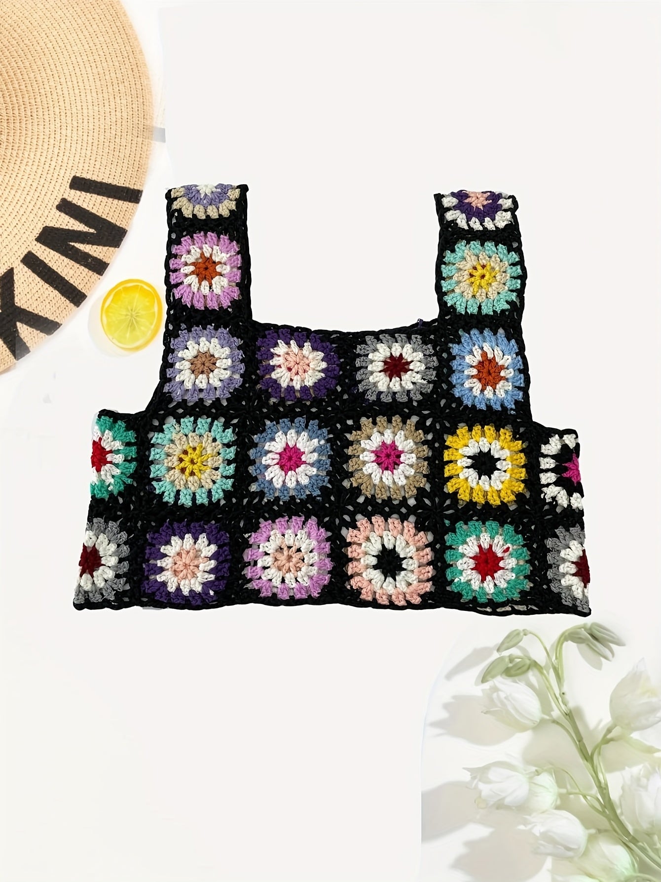 Floral Crochet Top, Sexy Squared Neck Summer Beach Wear Sleeveless Top, Women's Clothing