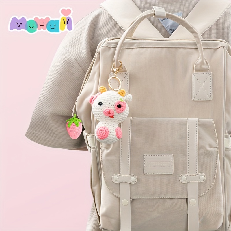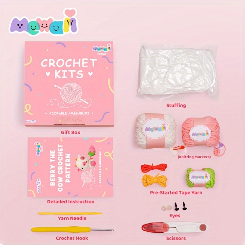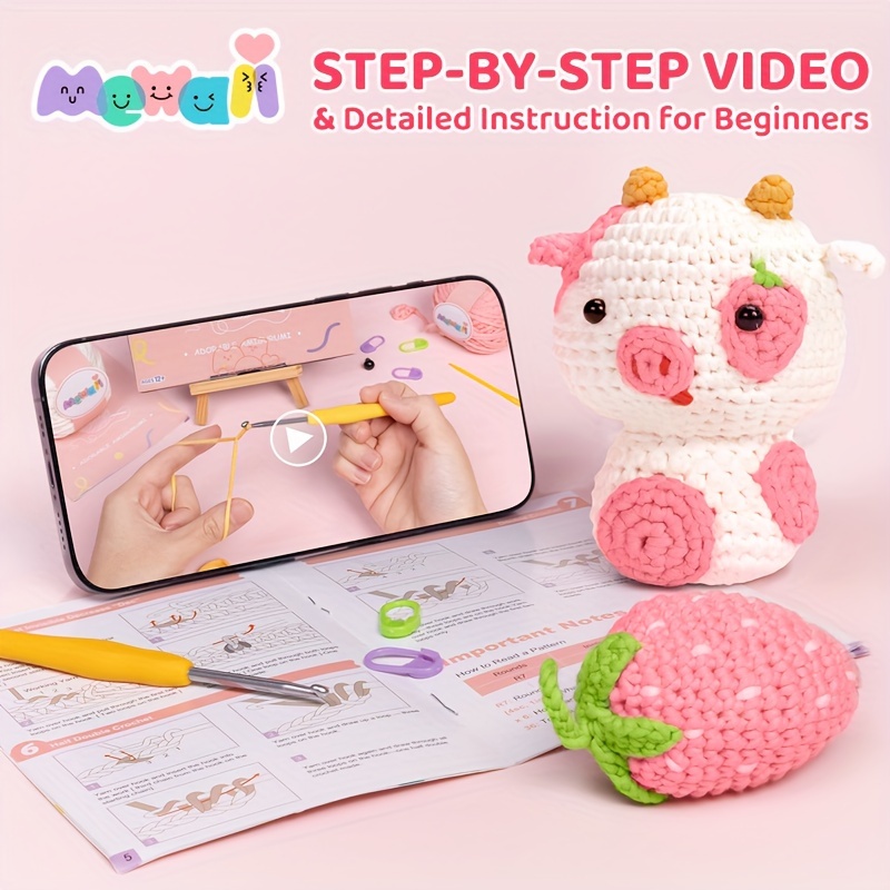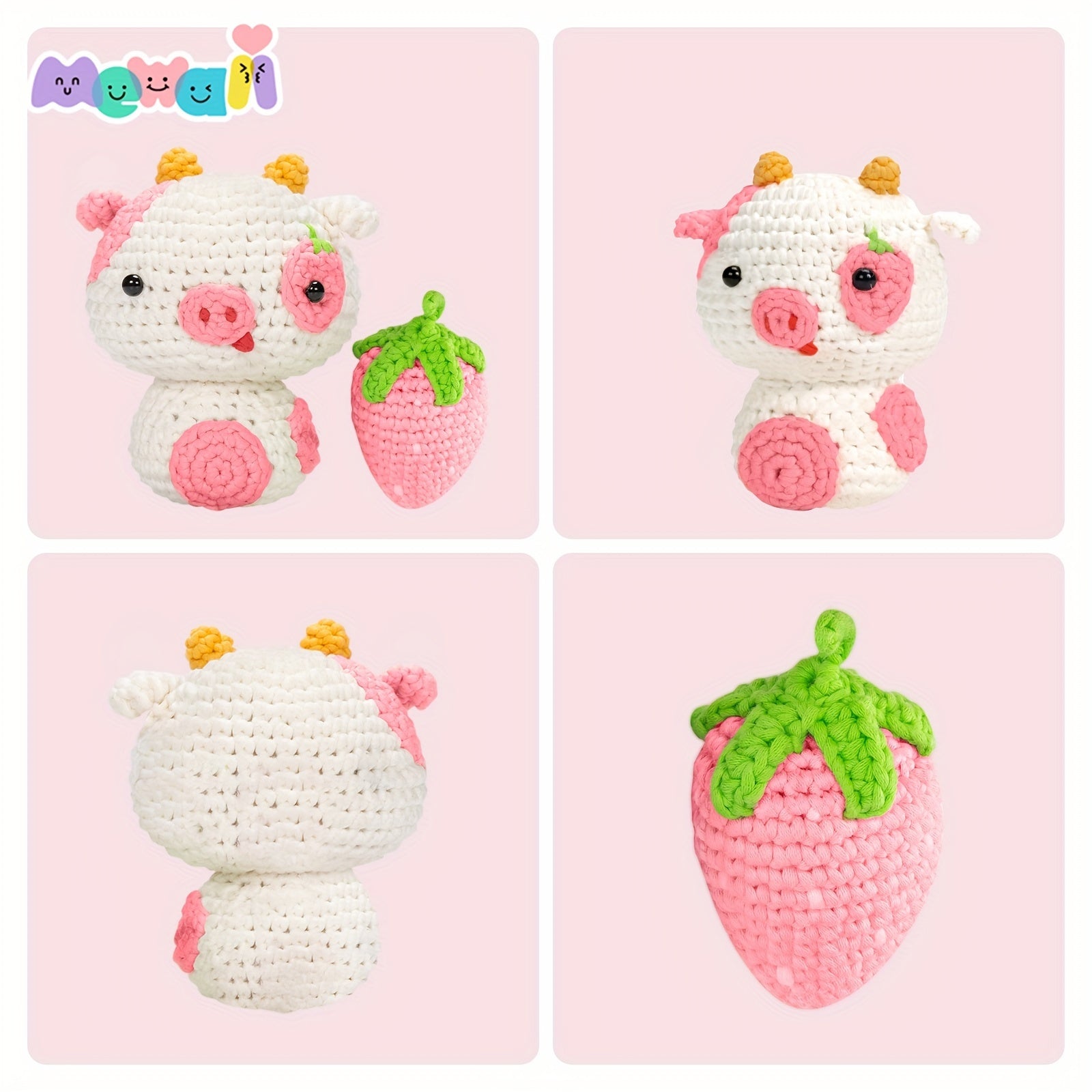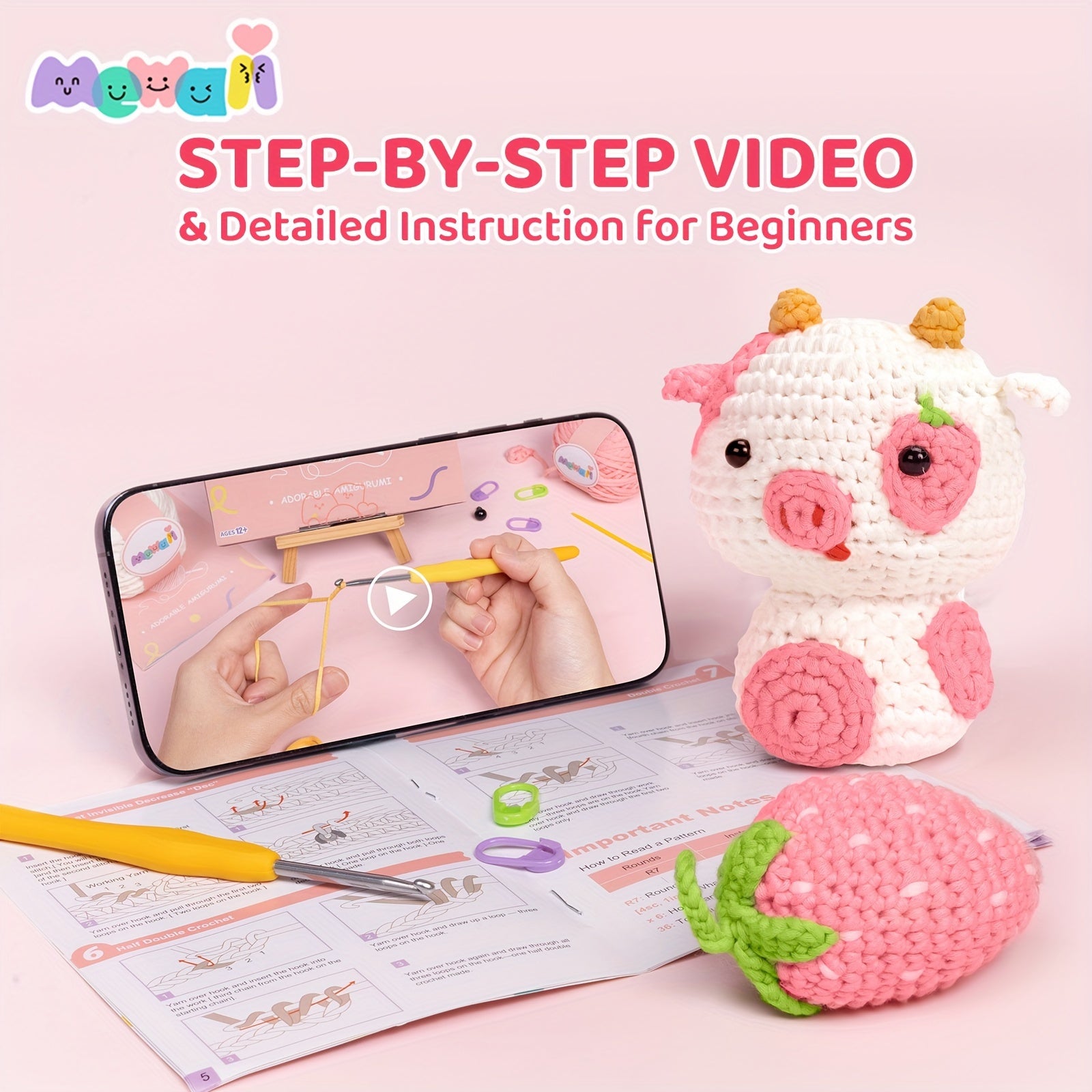 Mewaii Strawberry Pink Cow Crochet Kit For Beginners, Complete DIY Crochet Kit Animals With 40%+ Pre-Started Tape Yarn Step-by-Step Video Tutorials Halloween Birthday Easter Christmas Gift